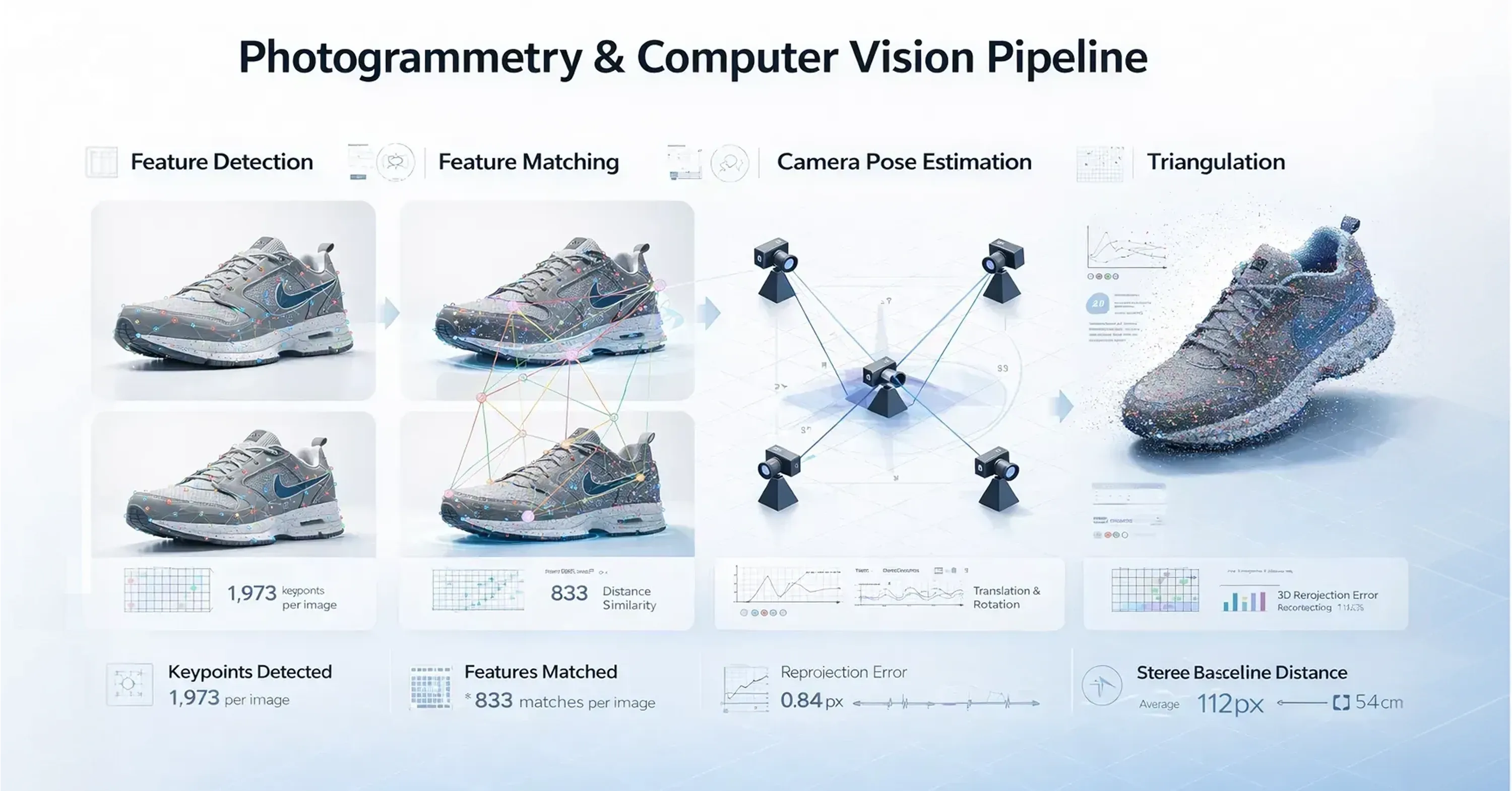 Geometry Generation: The software calculates the camera positions and the 3D coordinates of the matched points.