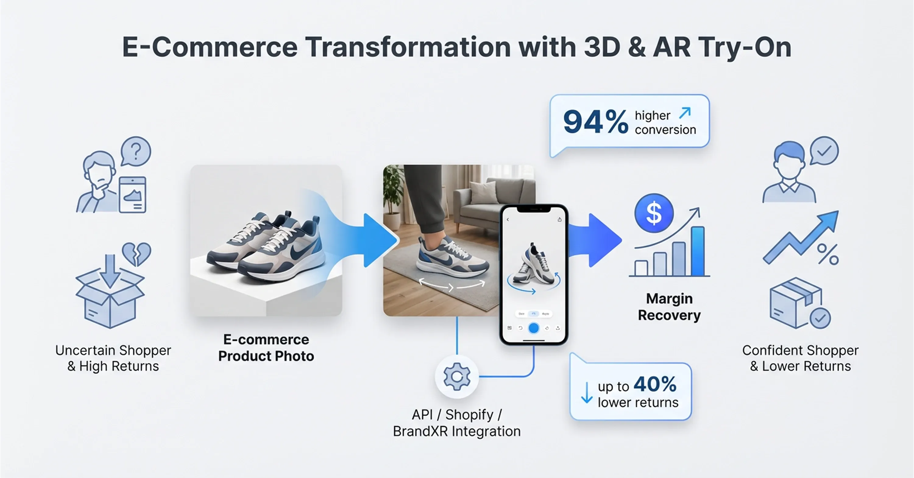 Shopify's data, cited in BrandXR's 2025 Augmented Reality in Retail research report, shows that products with 3D and AR content generate a 94% higher conversion rate than products with flat images. Brands employing AR for visualization have also reported up to a 40% decrease in product return rates, potentially saving millions in reverse logistics costs. Combining this conversion lift with reduced return logistics reveals substantial margin recovery potential for fashion brands.