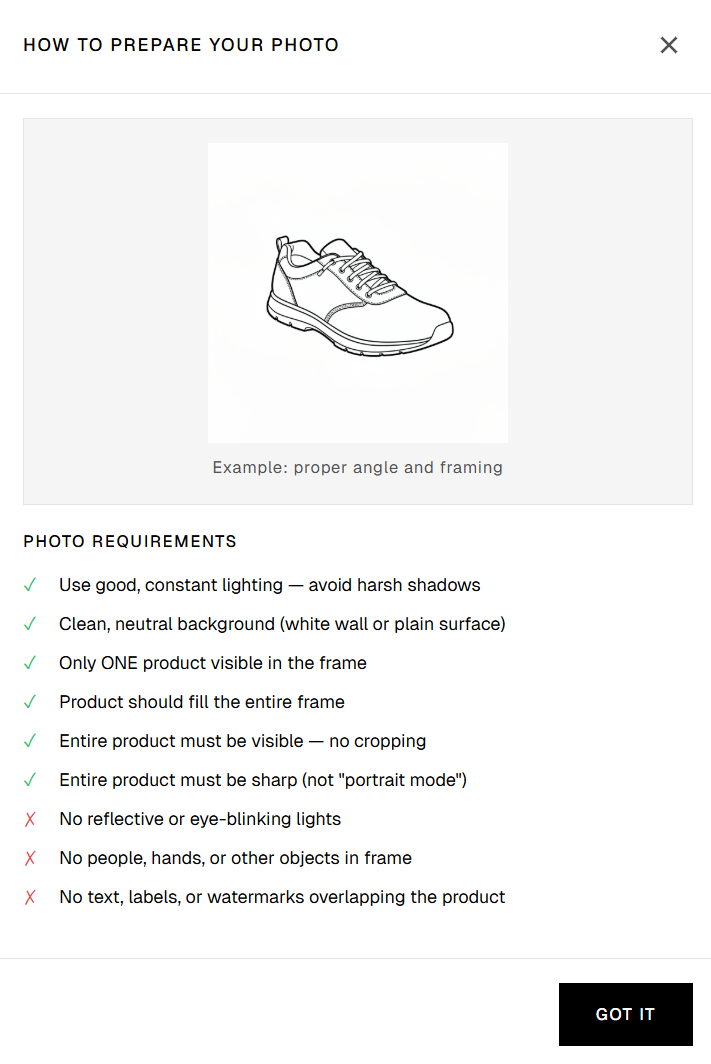 Before uploading, open “How to prepare photo”. Use clean, sharp images with a plain background and keep only one product in frame.