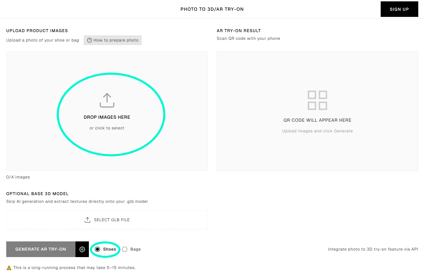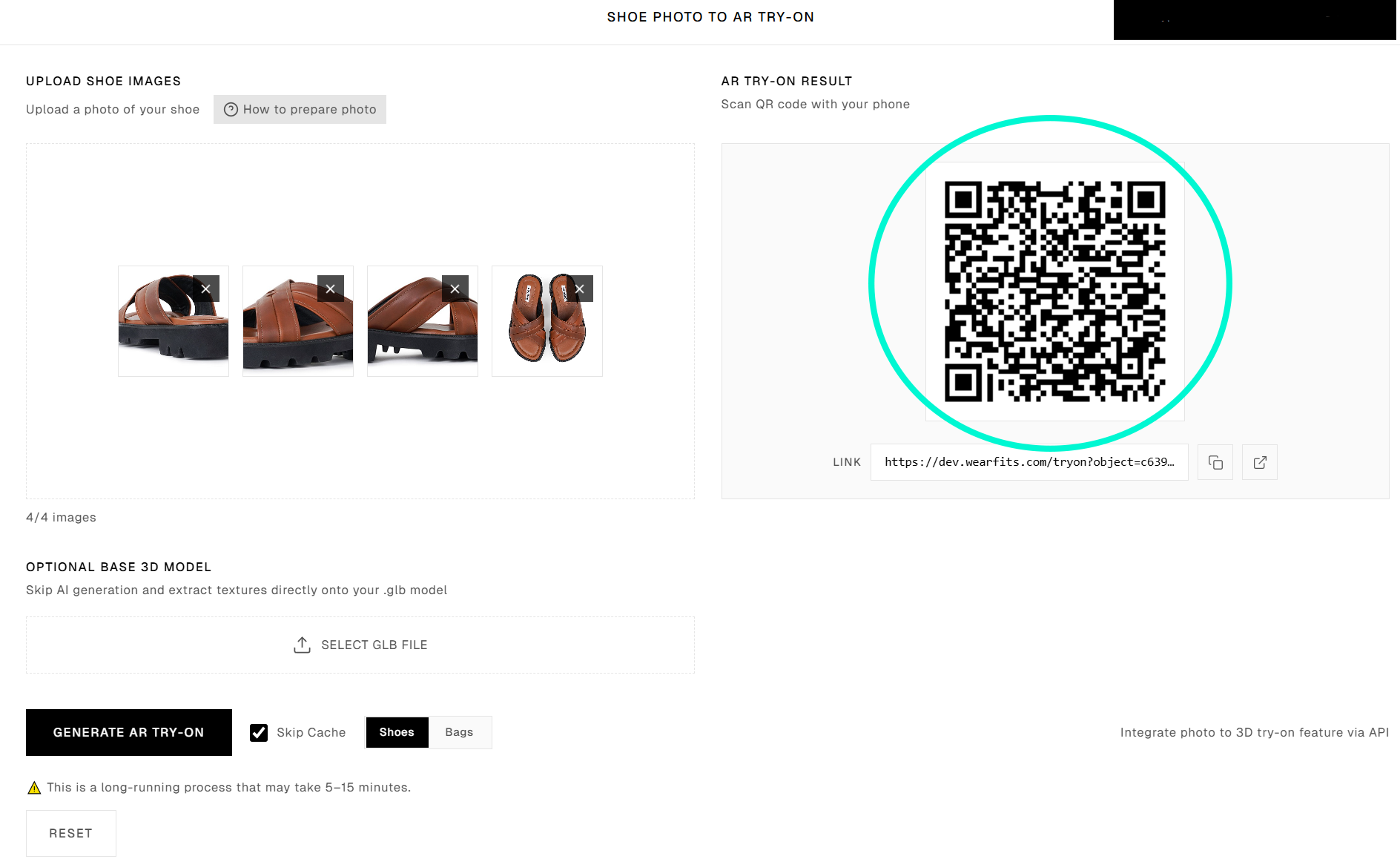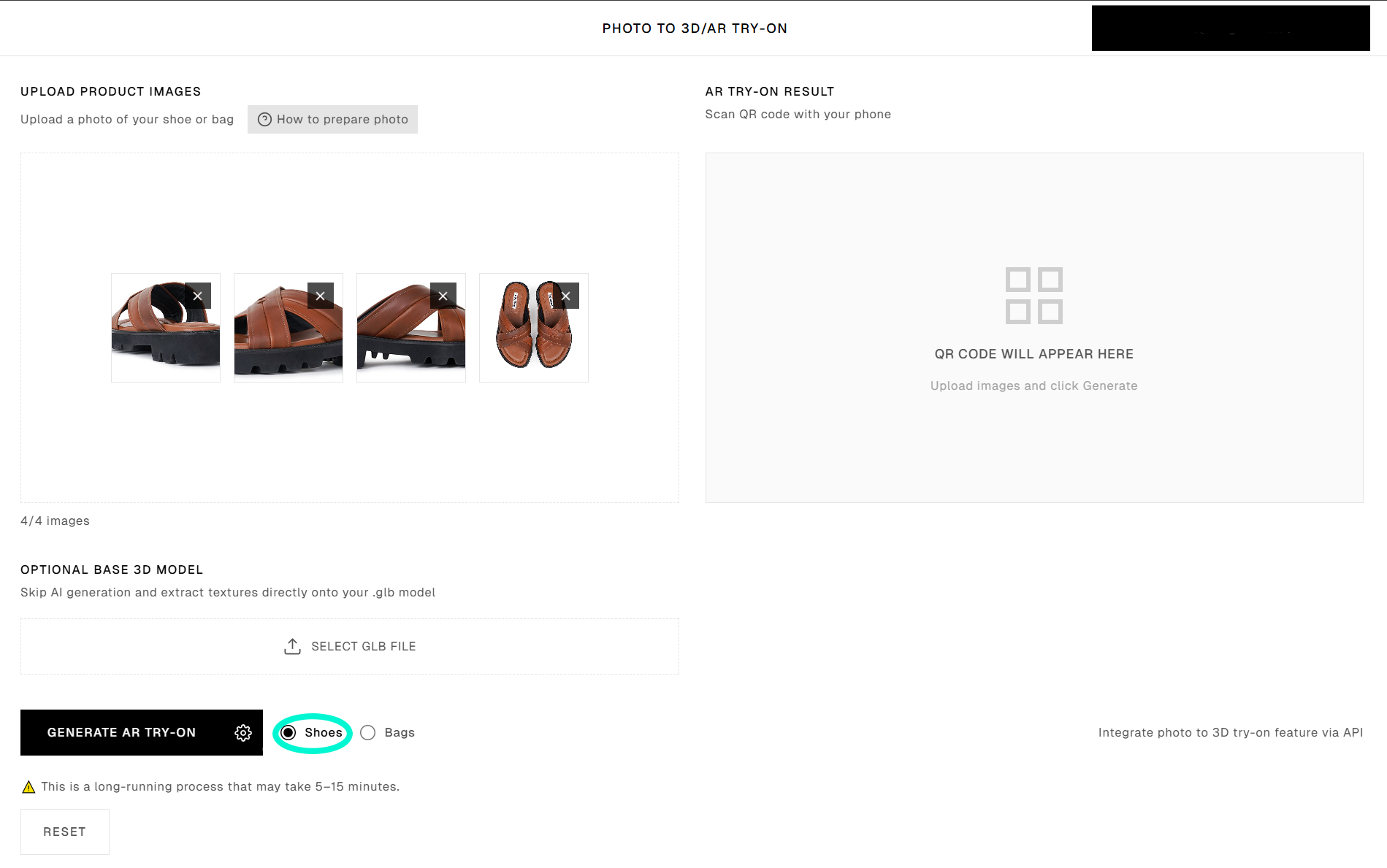 Add four photos from different angles, select “Shoes”, and then click “Generate AR try-on”.