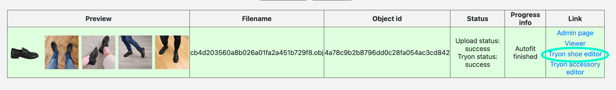 When the upload is complete, open “Tryon shoe editor” from the model row to continue the setup.