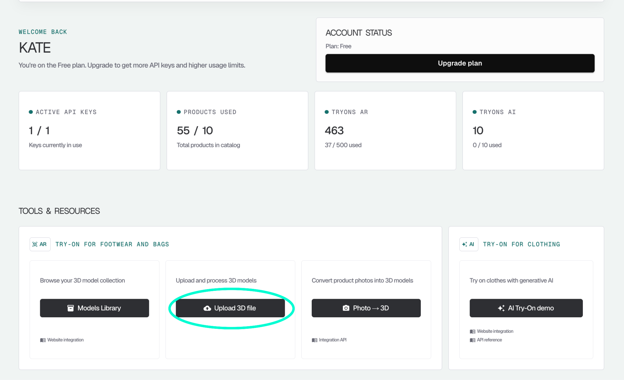 From the dashboard, click “Upload 3D file”.