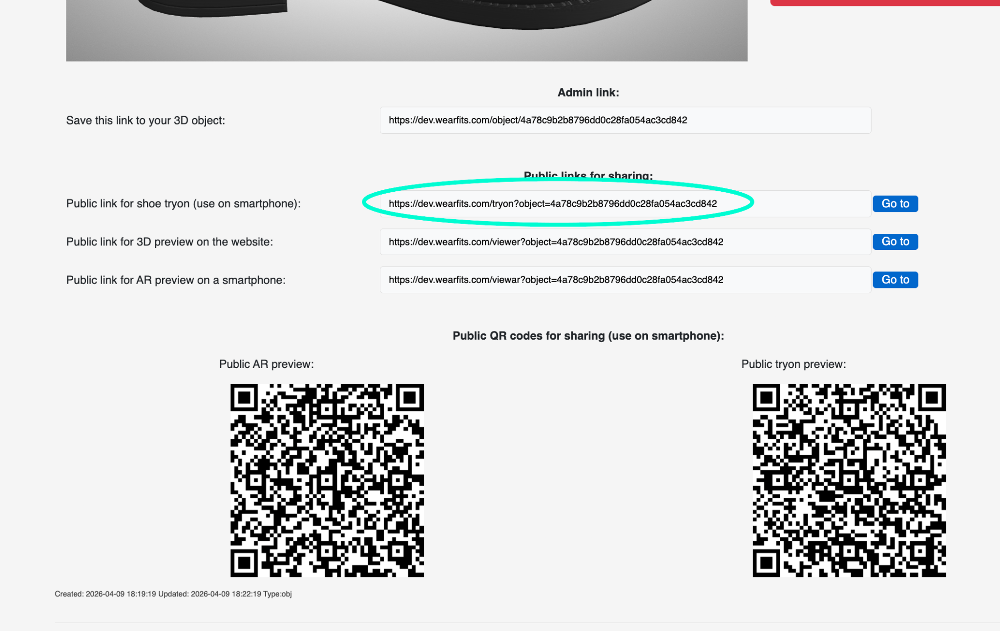 Use the public shoe try-on link or QR code to preview and share the final mobile experience.