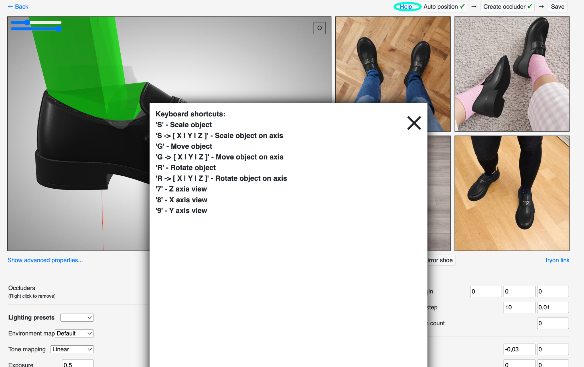 Open the shoe editor and review the fit on the foot. If needed, click “Help” to see the keyboard shortcuts.