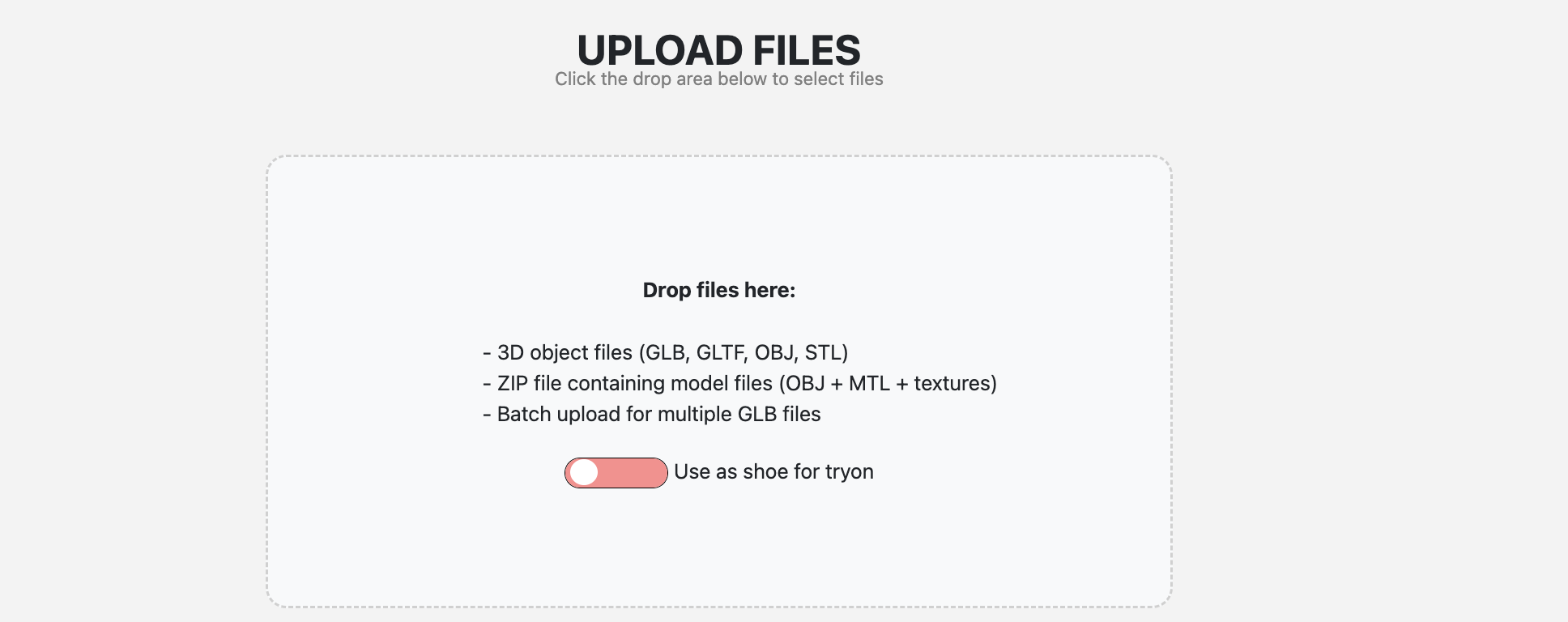 Drag and drop the file or select it manually. Keep “Use as shoe for tryon” enabled so the file is prepared for the correct flow.